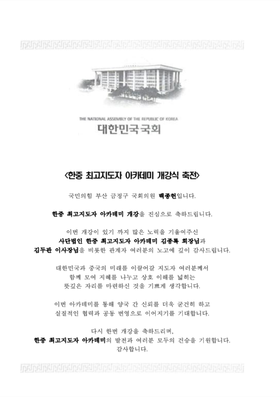 (사) 한중최고지도자아카데미 “한중, 함께 미래를 만들다” 출판기념회 축전